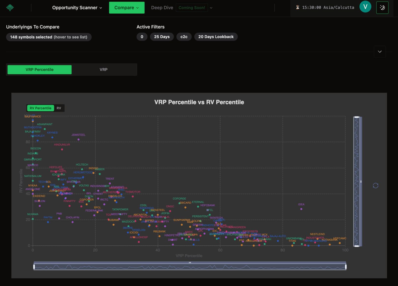 Scatter plots across IV, RV, VRP, and skew. See where any underlying sits relative to its own history and the broader market. For when you want the full picture.