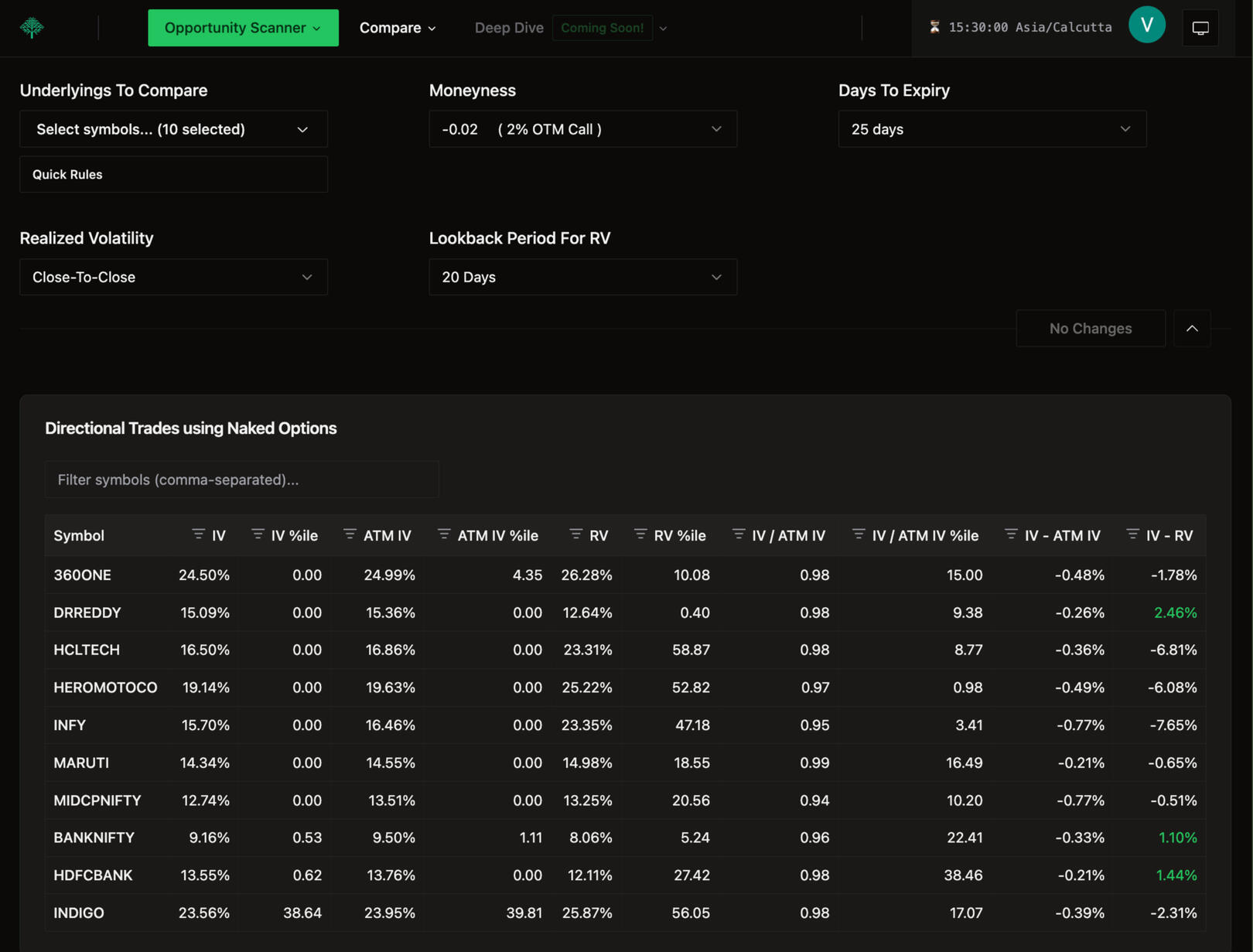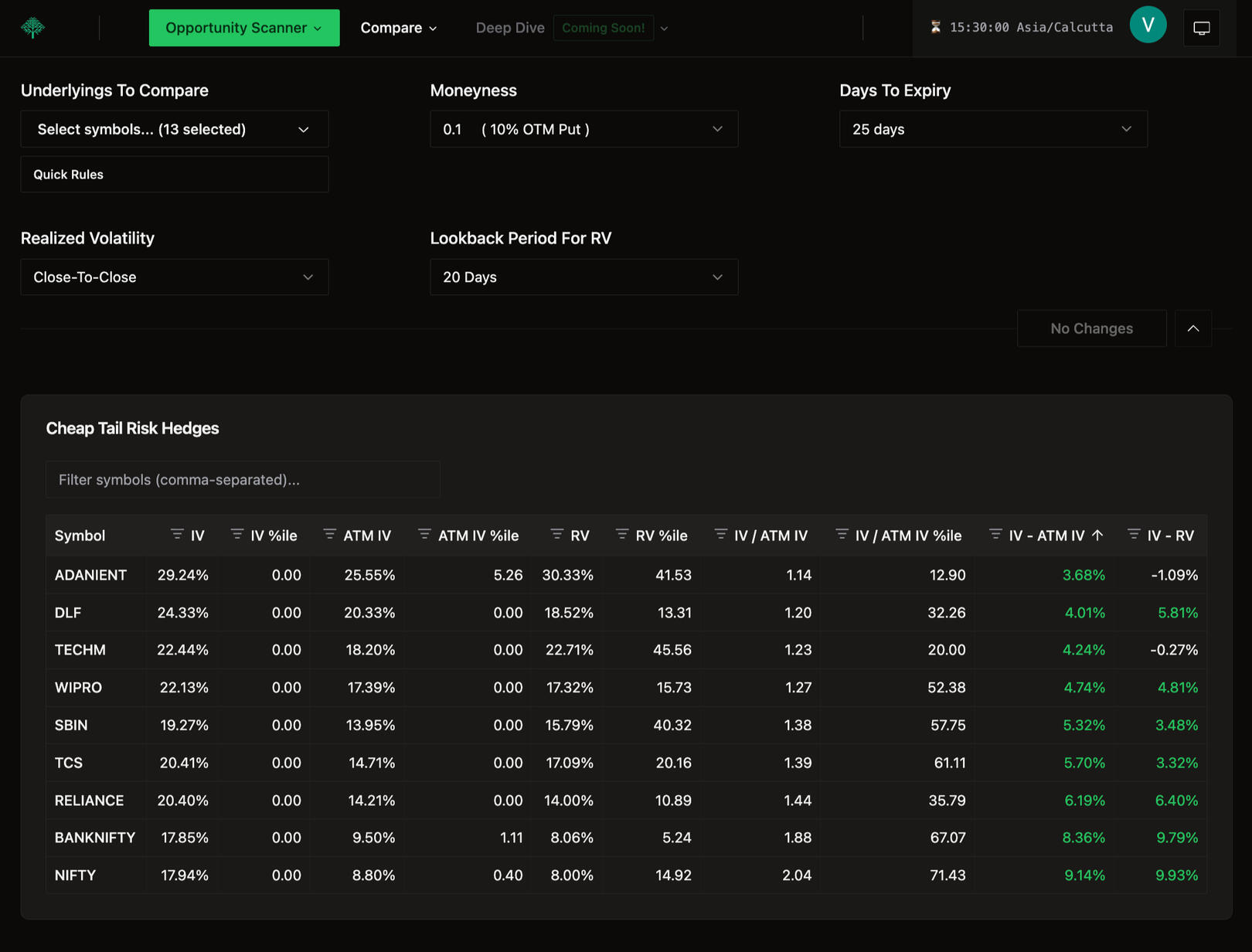 Institutional-grade options analytics without the complexity. Spot mispriced volatility and identify trade opportunities across 150+ NSE underlyings by the metrics that actually matter.